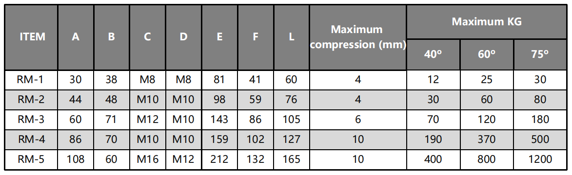RM Series Bell Mounts combine high-quality elastomeric rubber with a durable metal insert, creating a mount that is both flexible and strong. The rubber is specially formulated to resist oil, grease, industrial chemicals, and moderate heat, ensuring reliable performance in harsh environments. The metal insert provides structural support and ensures that the mount can handle high static and dynamic loads without deforming permanently. The rubber also exhibits high hysteresis, which allows it to effectively dampen vibration across a wide frequency range. This combination of materials gives RM Series Bell Mounts a long service life, even under heavy-duty operating conditions, and makes them suitable for applications where both vibration isolation and load support are equally important.